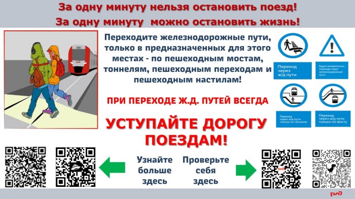 Для перехода через железнодорожные пути пользуйтесь пешеходными мостами, настилами и переездами, обращайте внимание на указатели, прислушивайтесь к подаваемым сигналам. Прежде чем перейти пути, убедитесь, что они свободны.
